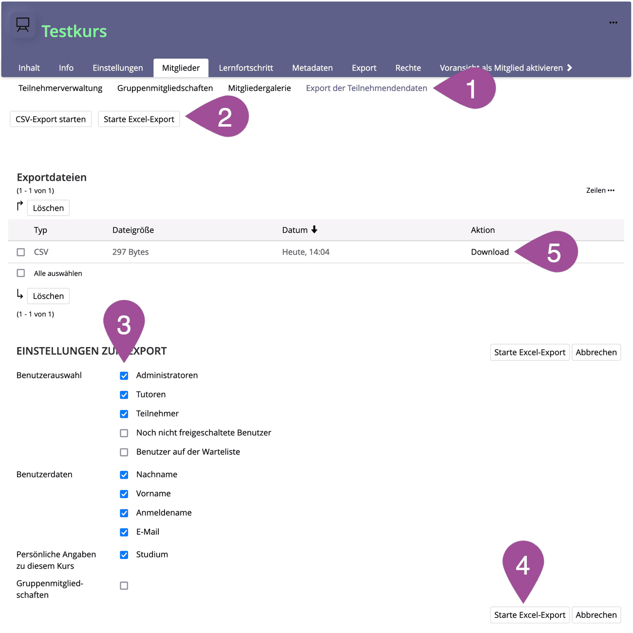 Check the data you want to include in the export. The «Course-specific user data» (see 2.5 Collect & view course-specific user data) are also available for selection. | |