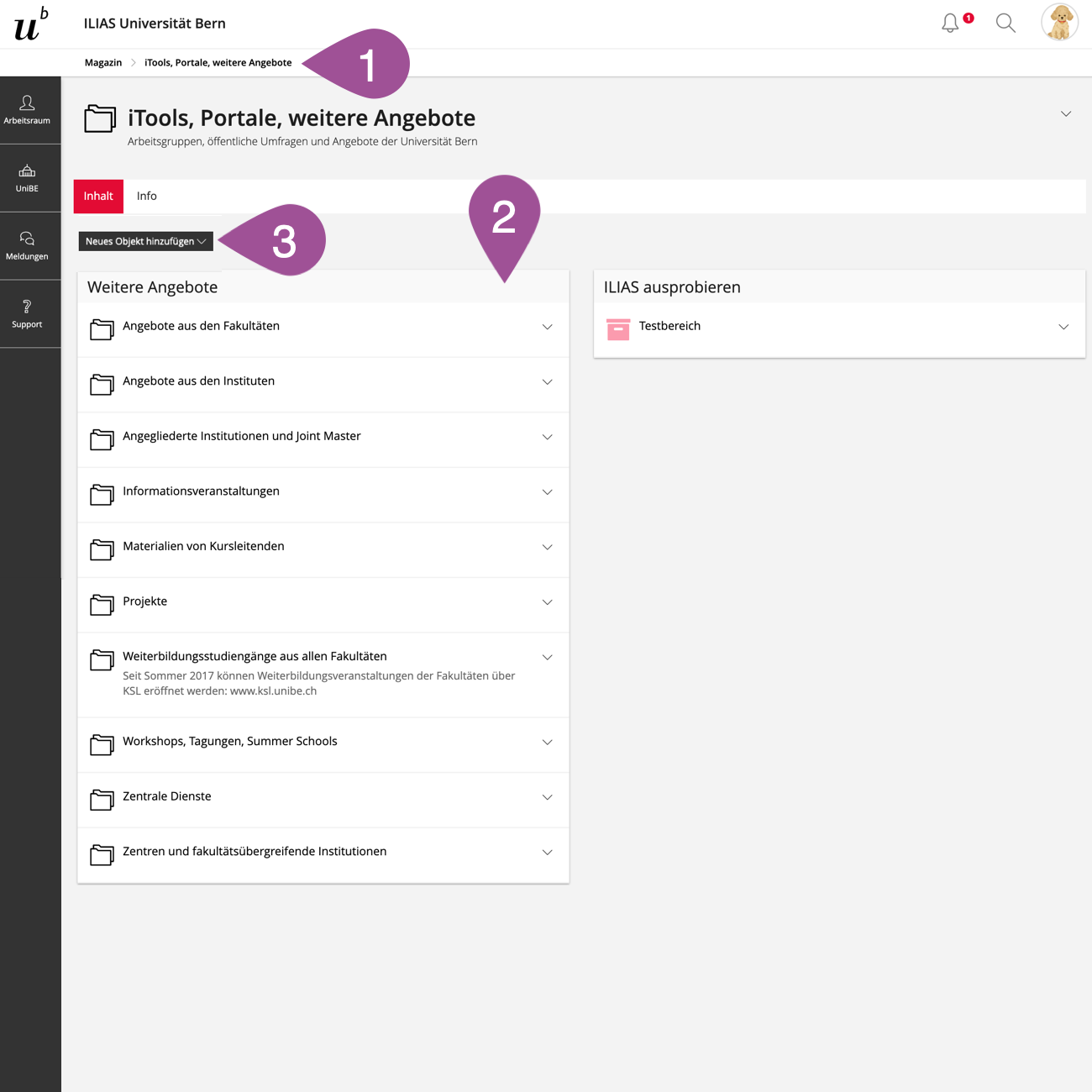 Create an ILIAS course yourself in the Portal Point area in iTools