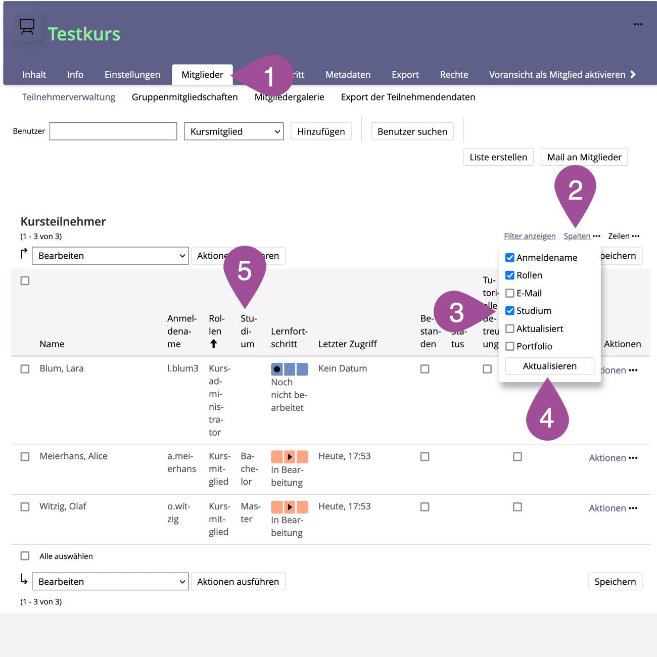 Via «Columns», you can view more information about the enrolled students, including the course-specific user data (see 2.5 Collect & view course-specific user data). | |