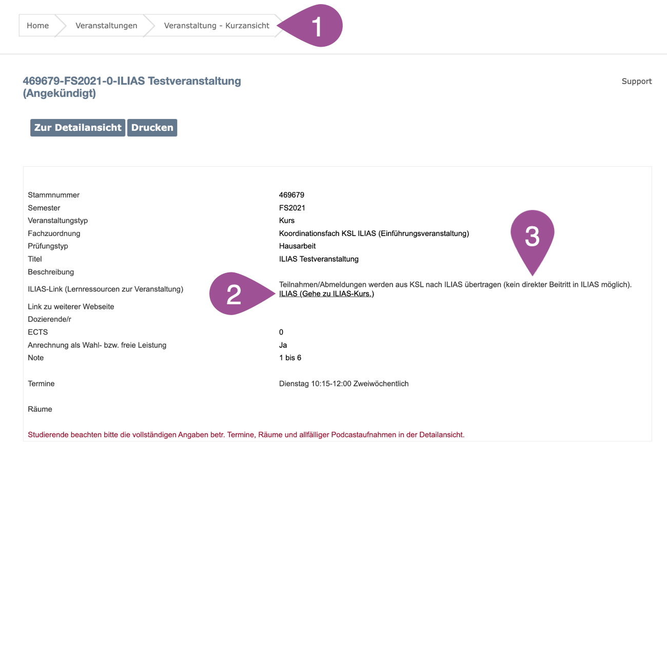 If several root numbers are merged into one ILIAS course, all course dates entered in KSL will be created as sessions in the ILIAS course. Course administrators will thus see what appears to be the same session multiple times. Contact us if you prefer other solutions.