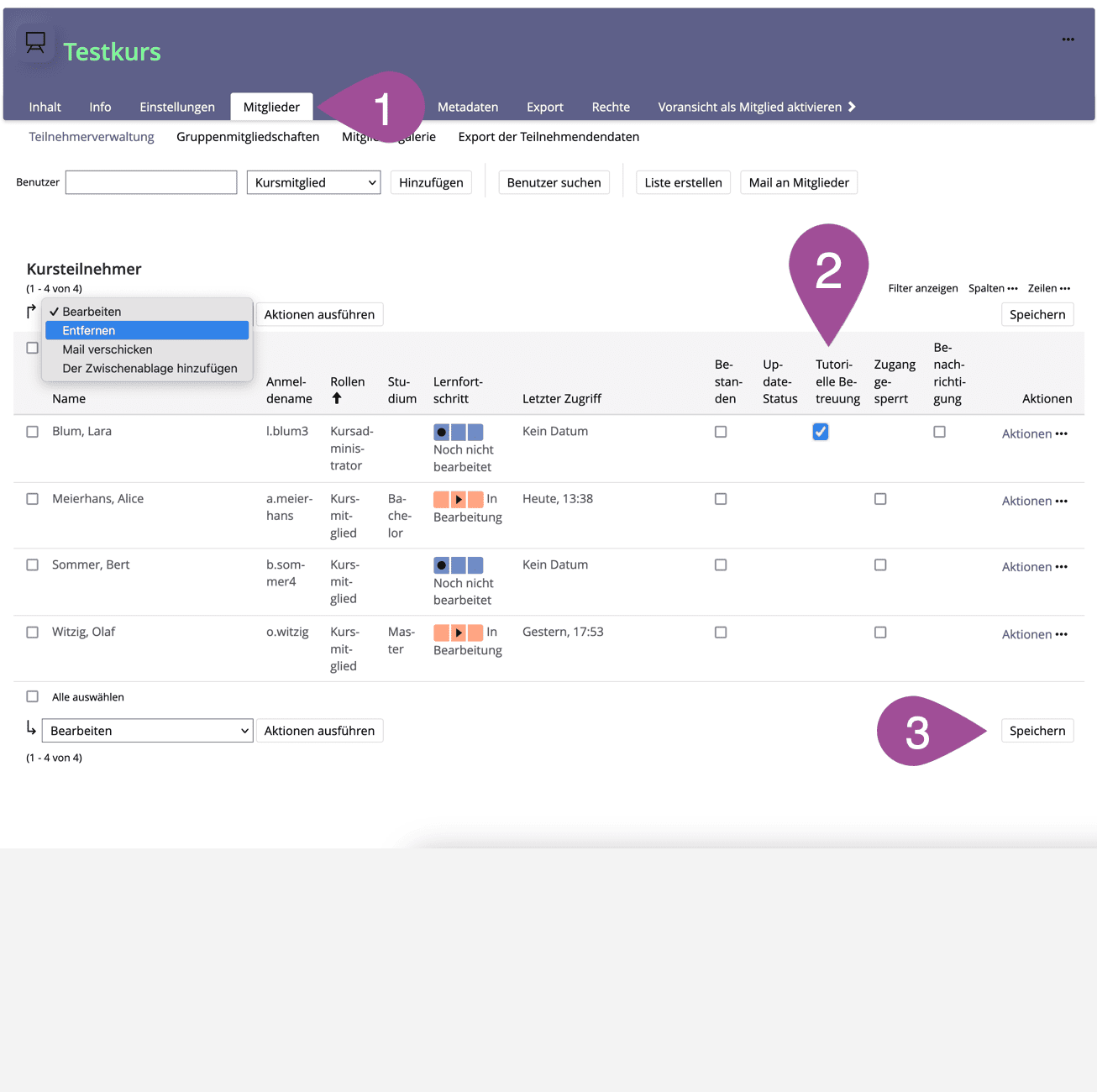 In a course, you can give tutor and administrator rights to certain people in your course. Administrators have all permissions within a course, tutors have fewer permissions, and members have more limited permissions. If the person is not yet registered in the course, you can add them as an administrator or tutor (see 4.5 Add course members manually). If the person is already enrolled in the course and you want them to have a different role, follow the steps below: