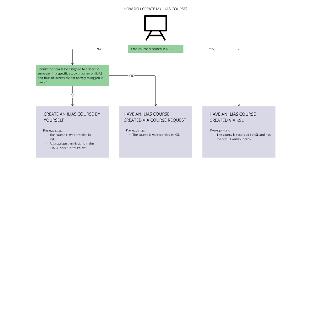There are three ways to create an ILIAS course at the University of Bern. Which one is appropriate for you depends on whether the class for which the course is to be created is recorded in KSL and whether the course is to be assigned to a specific study program and a specific semester: