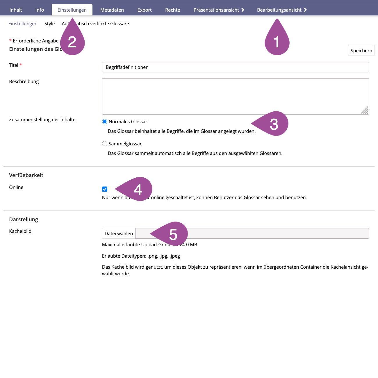 Under «Tile Image» you can upload a tile image for the glossary (see also Manual: Tile design).