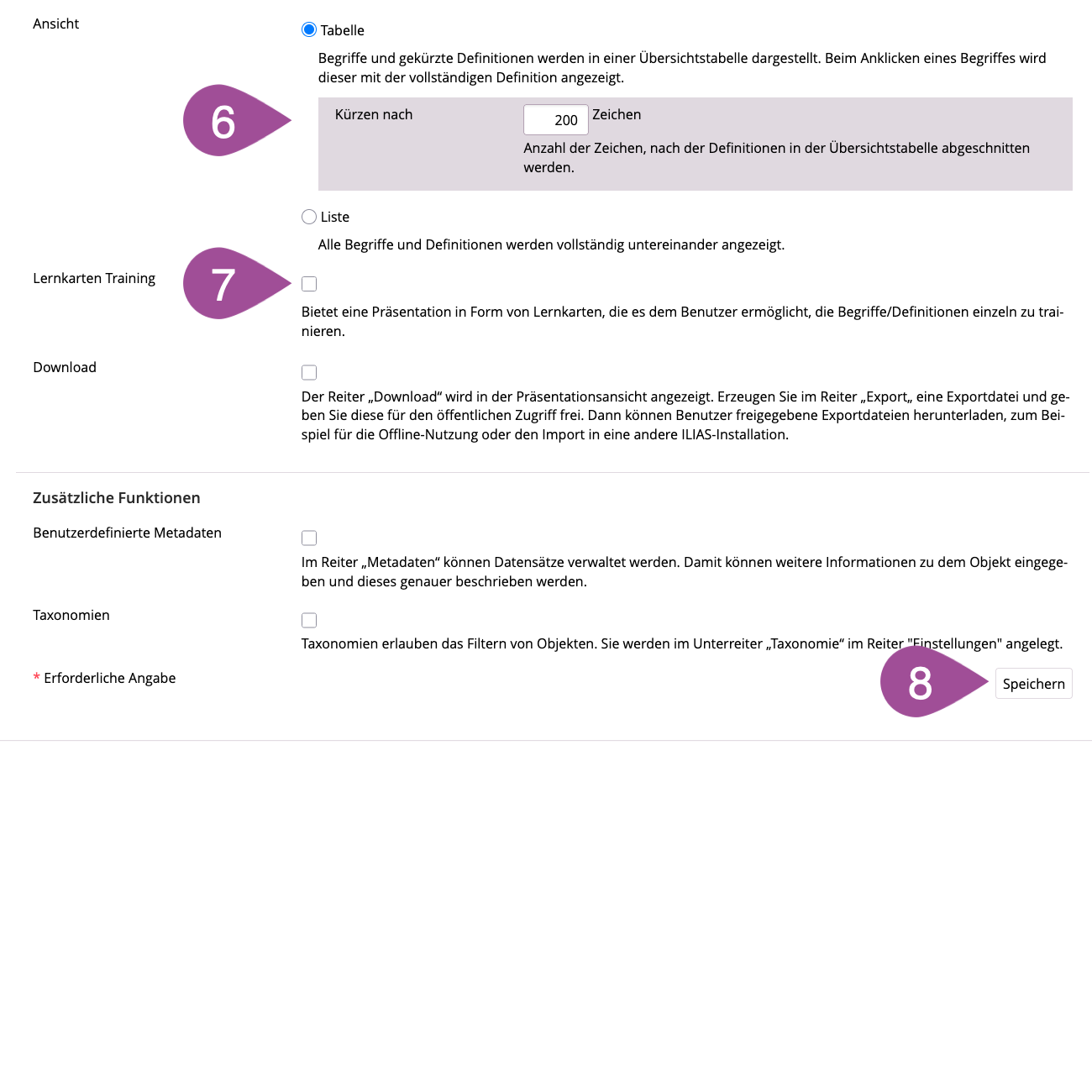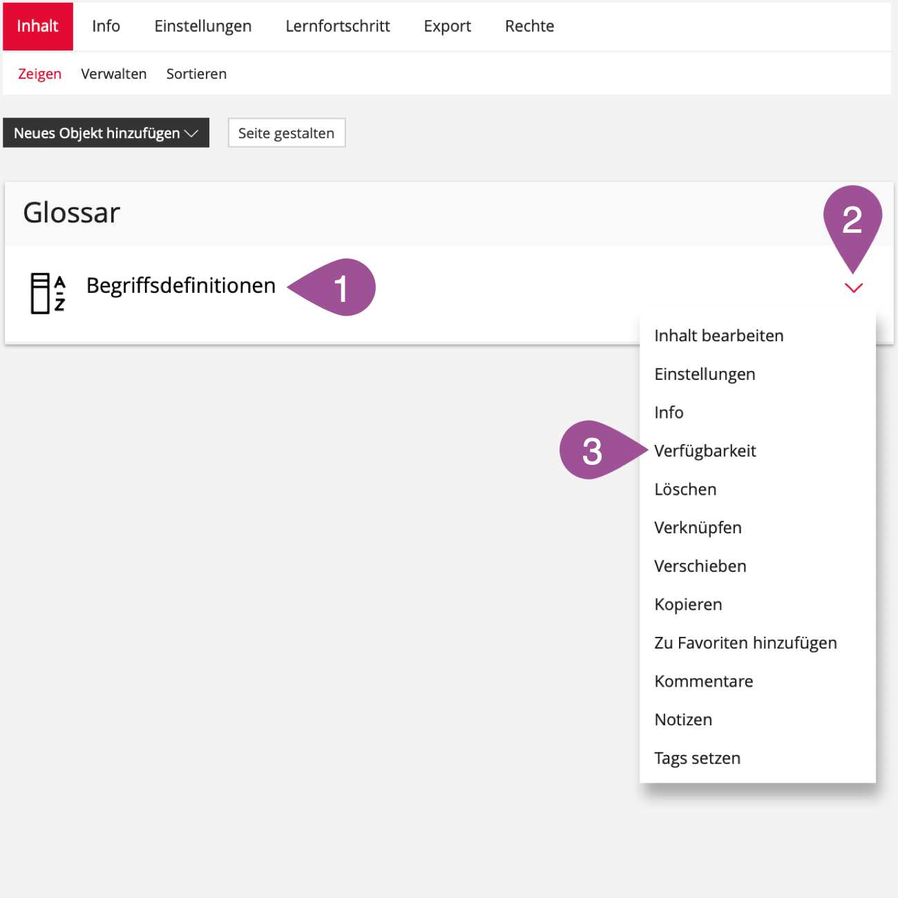 A glossary can be combined with an ILIAS learning module: If a glossary is linked to a learning module, terms from the glossary are automatically linked in the learning module text. Terms do not have to be manually adjusted and inserted into the learning module.