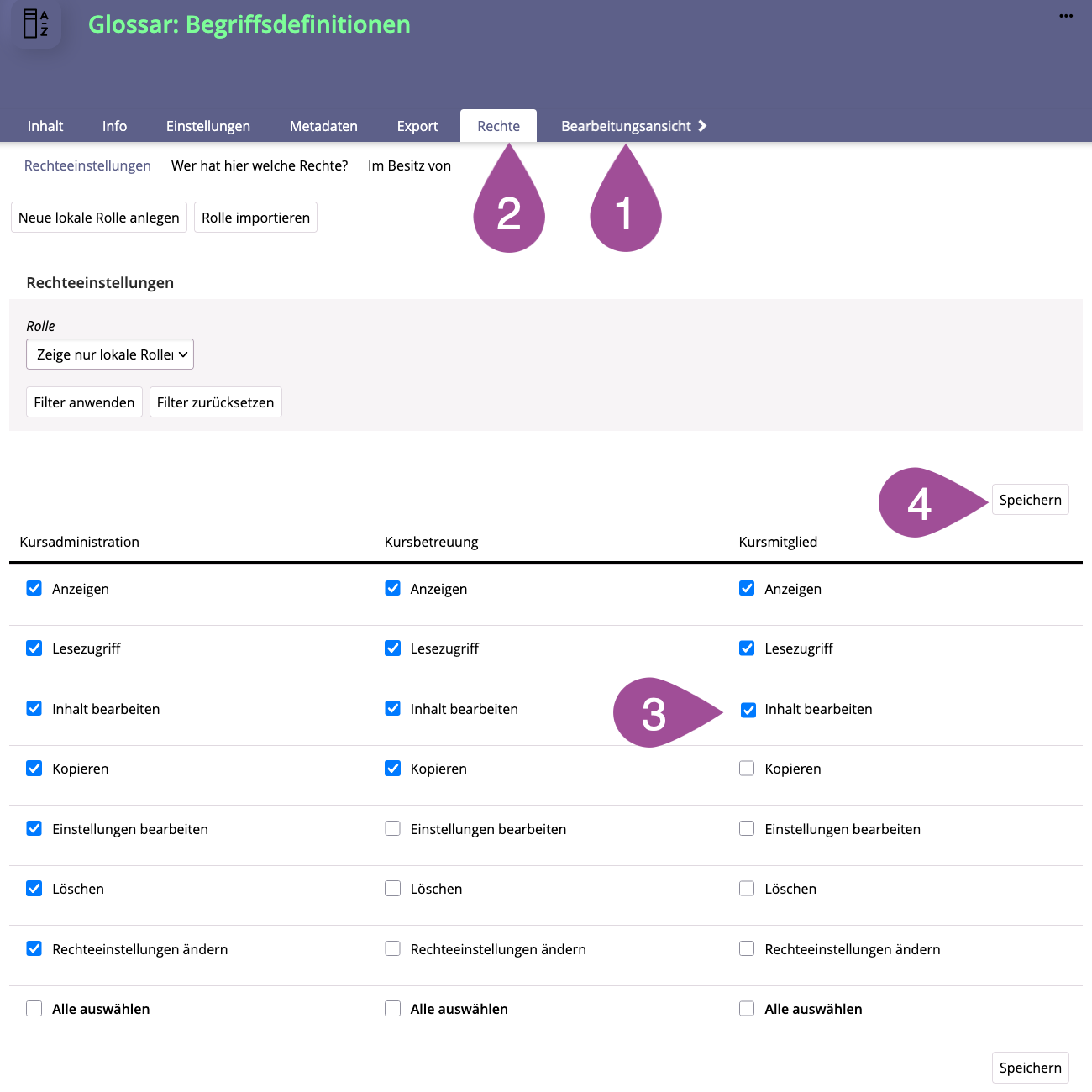 In order for students to contribute to the glossary, the «permissions» of the glossary have to be adjusted accordingly. Follow the steps below to do so: