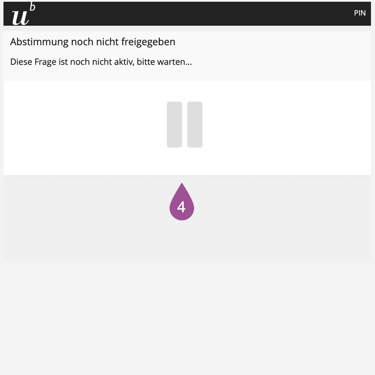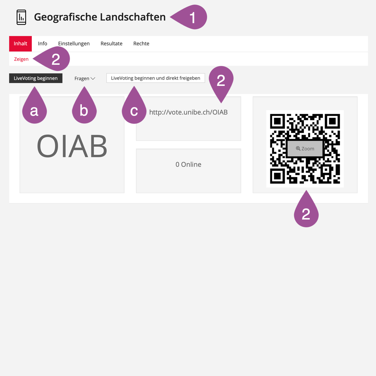 In the «Content» tab, go to the «Show» sub-tab. Present the QR code, PIN and URL to your students: vote.unibe.ch. Participants scan the QR code or enter the URL and then the pin in a browser.
