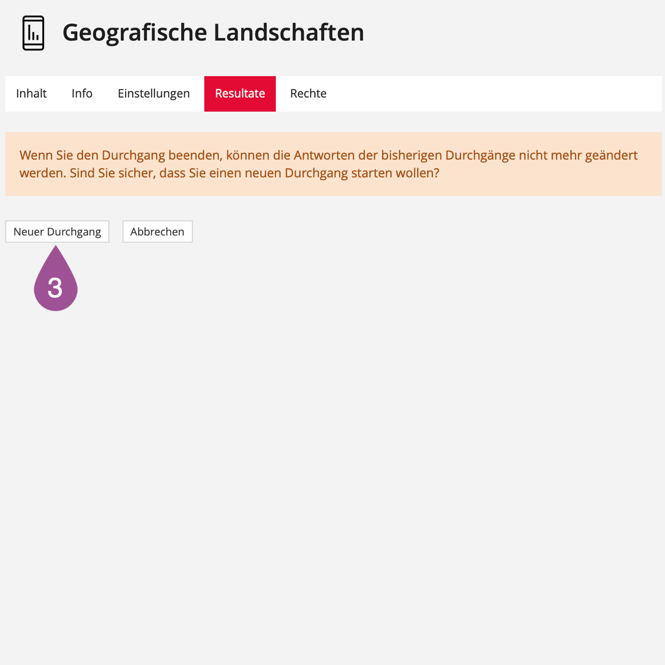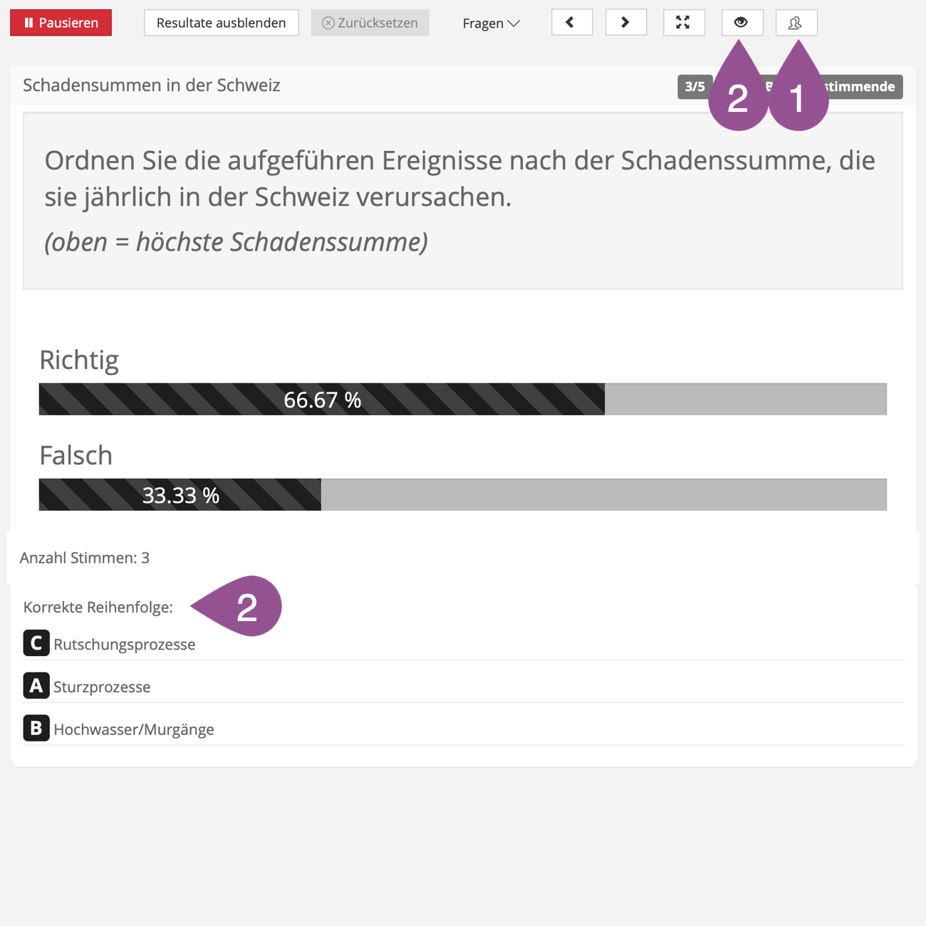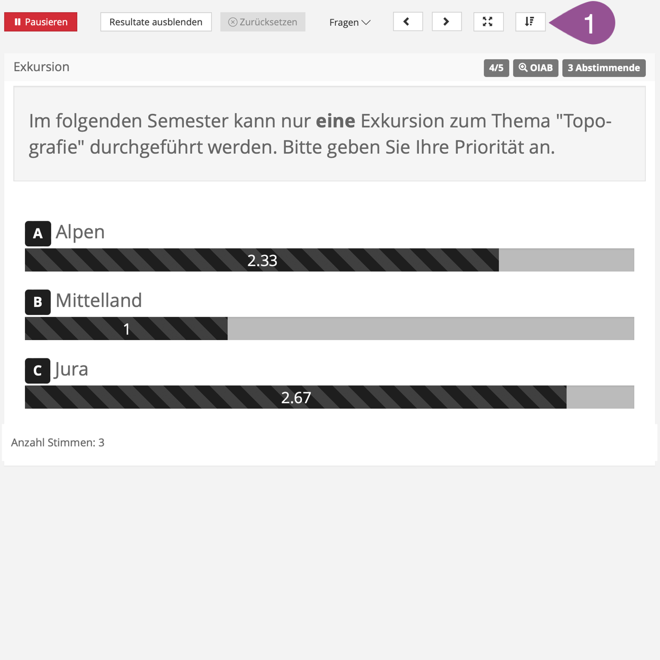 You can run a LiveVoting in multiple rounds. For example, you can ask your students the same question several times at different times without having to delete the previous results. You can view the results of the different rounds afterwards (see 5.6 View & export results retrospectively).