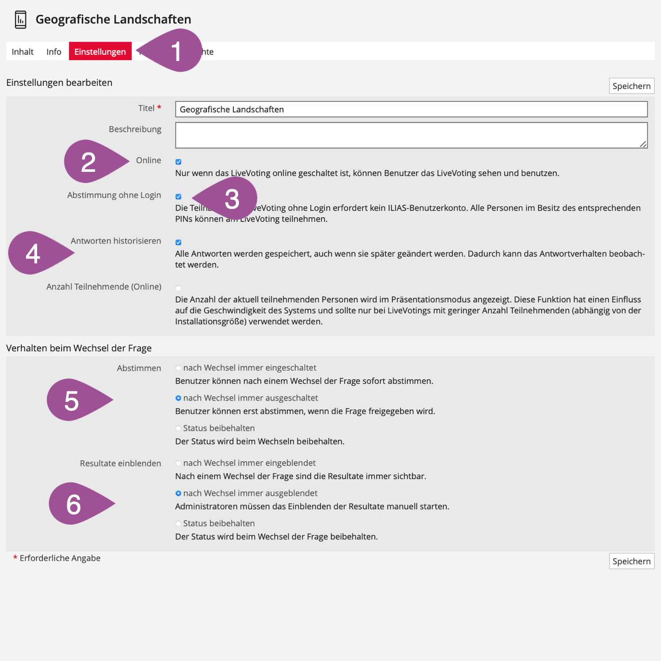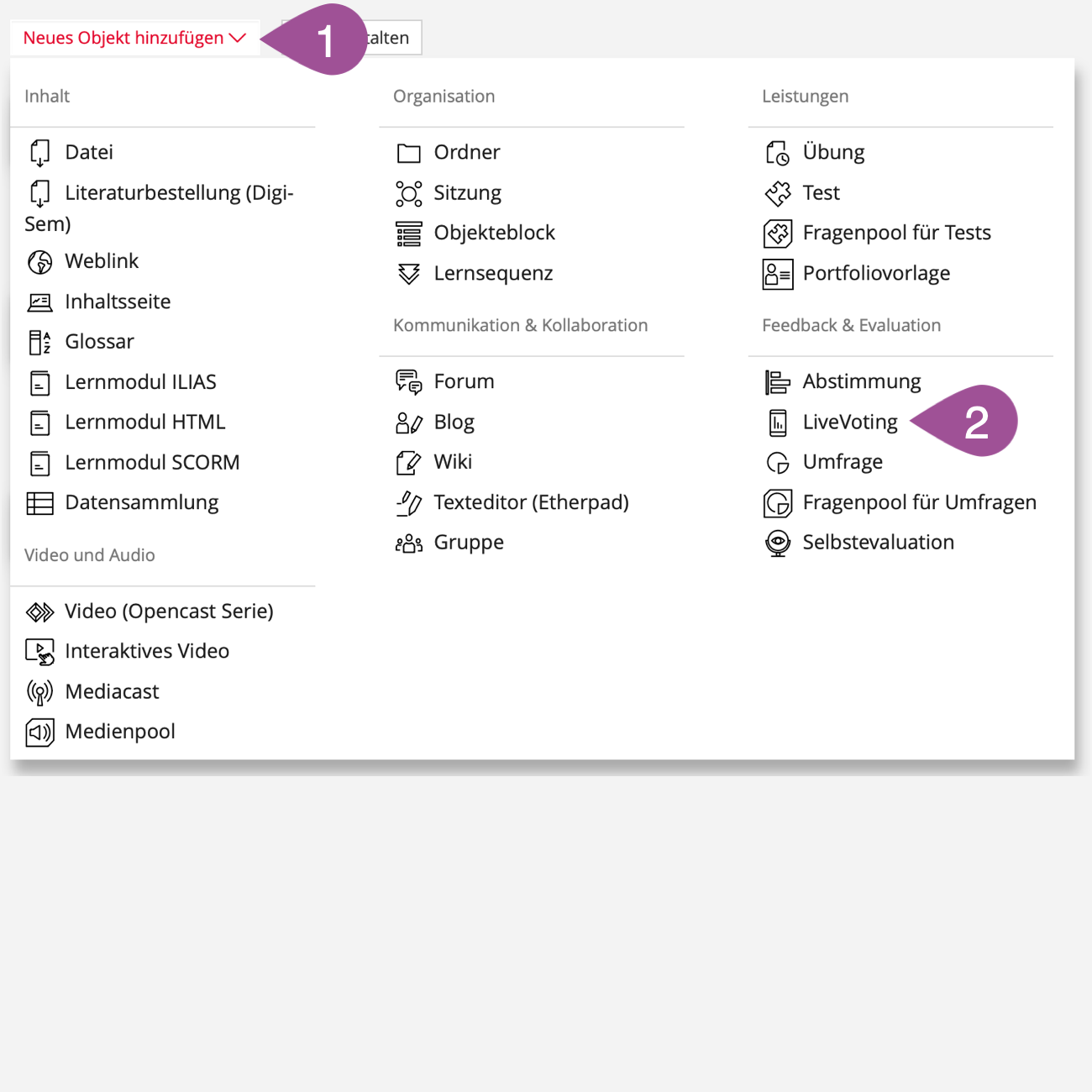 To conduct a LiveVoting, you must be logged in to ILIAS as an administrator and the LiveVoting must be «Online». In the classroom, proceed as follows: