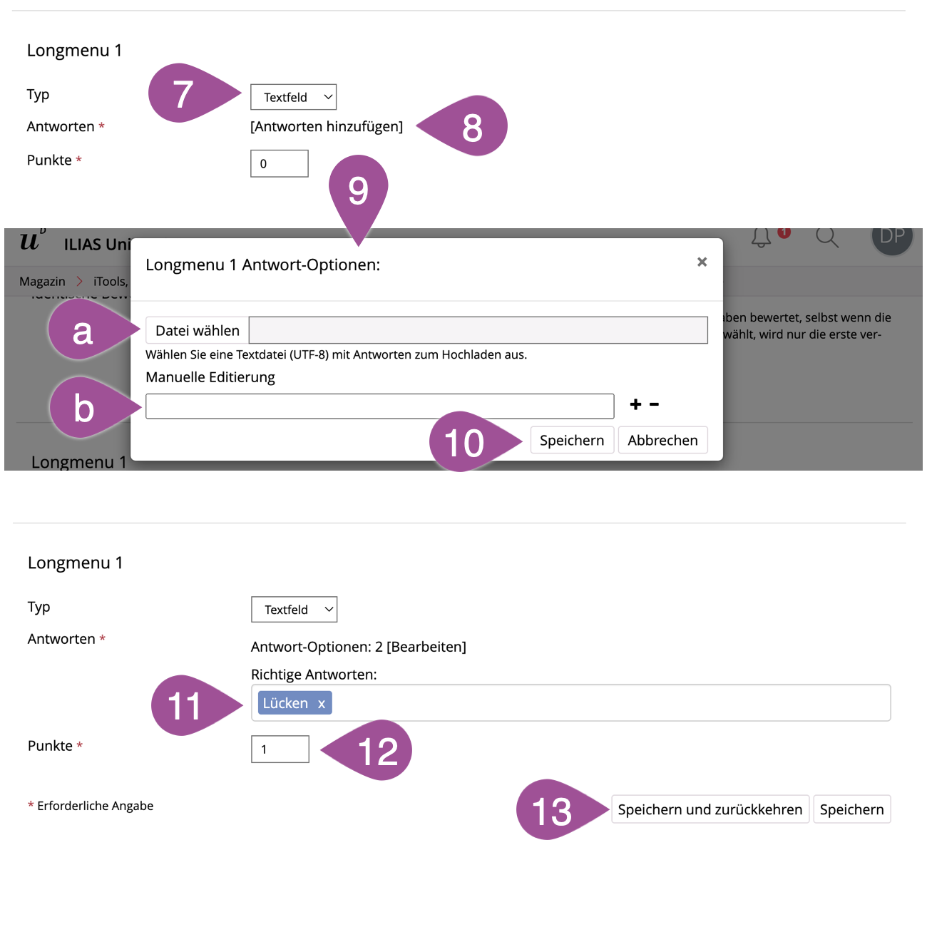 «Create Test Export File»: You can export your test, including questions and settings, as a compressed ZIP file and import it to another ILIAS installation. Please note, however, that this export does not contain the participants' responses. | |