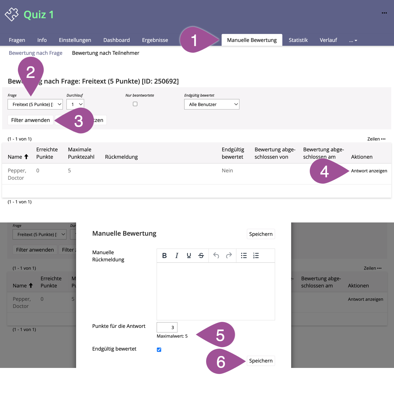 If you used the question types «Essay Question» and/or «File Upload» without a method for automatic scoring (see Essay Question and File Upload), you need to score the answers manually for each question. Other question types with text entries can also be scored manually. Otherwise, this step can be skipped.