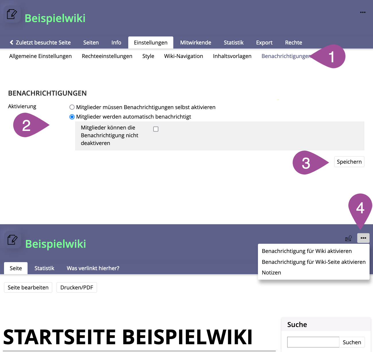 As an administrator, you can set whether all course or group members are automatically notified of changes to wiki pages or whether they have to enable these notifications themselves.