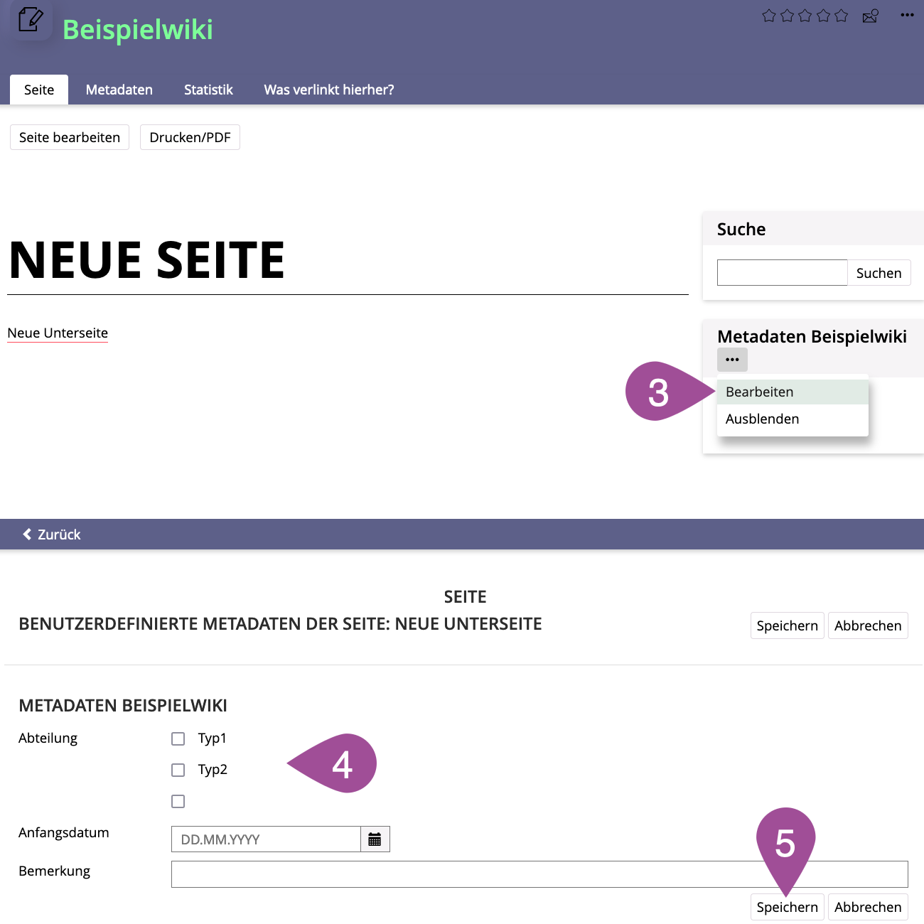 You can use metadata to categorize wiki pages and generate automated page lists (see 3.2 Add content to a wiki page). Metadata consists of metadata sets and individual fields. After you have defined the datasets and fields, you can assign metadata to your wiki pages and have page lists generated automatically based on these assignments.
