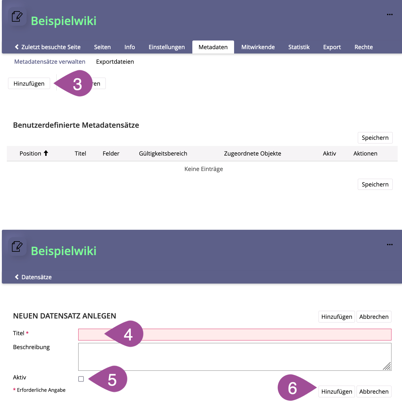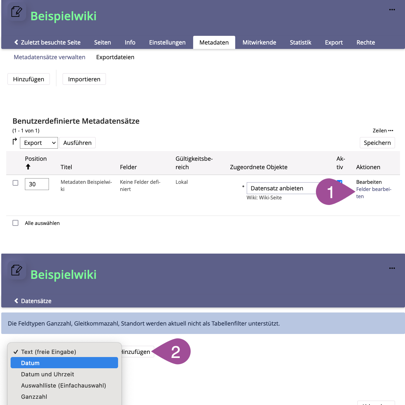 If you want to use metadata to create page lists (see 3.2 Add content to a wiki page), keep in mind that the content of the page list may depend on whether the selected metadata was created in a single or in multiple datasets: