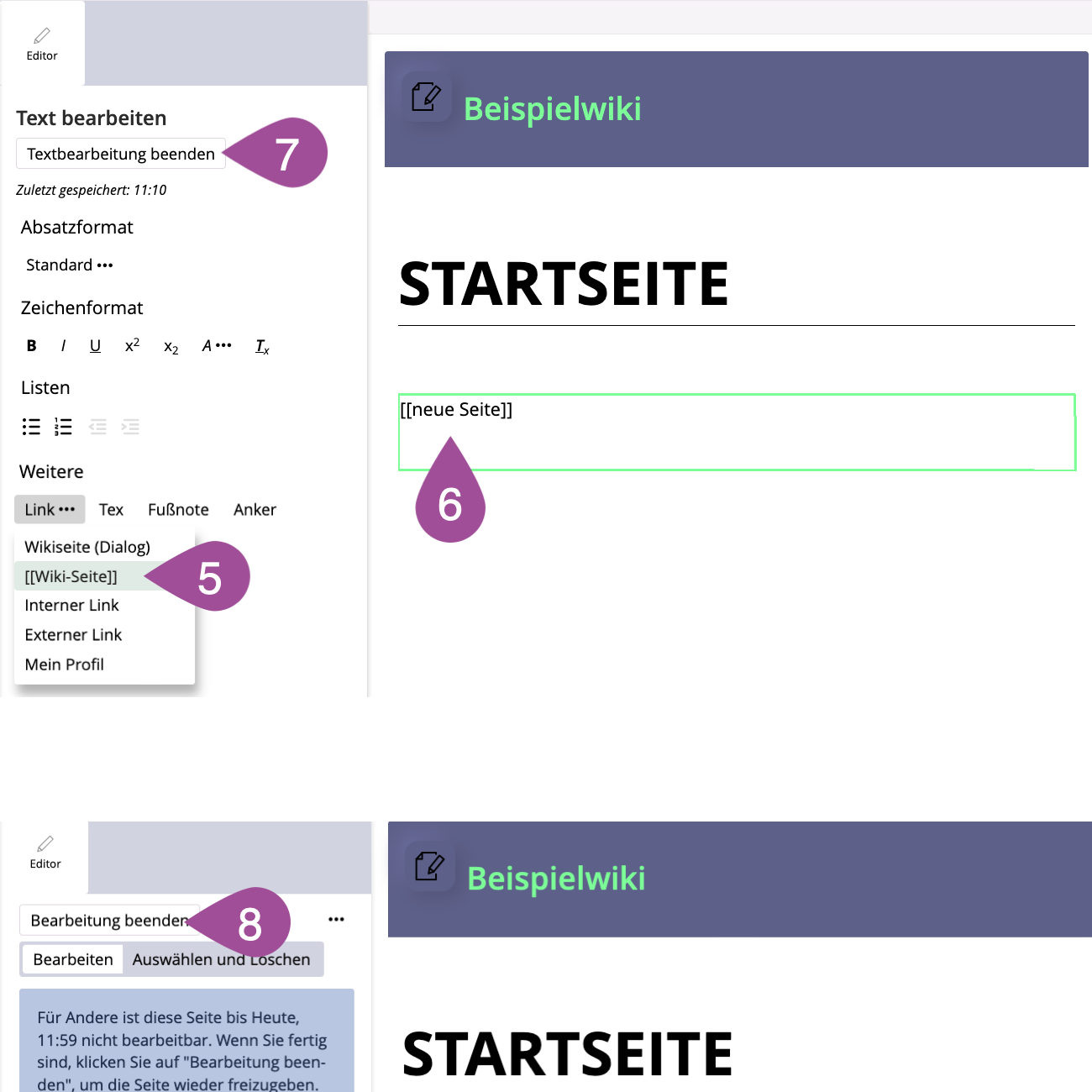 Place the title of the new page between the opening and closing brackets. In the same way, you can also insert additional links to already existing pages. To do this, enter the title of the existing page between the brackets. | |