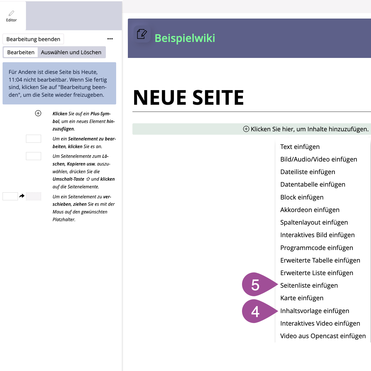 If you want to create several wiki pages with the same layout, you can save existing pages as a template. You can then use this template to create new pages (see 3.1 Create a wiki page) and/or add it to existing pages (see Point 4). This way, you do not have to insert recurring elements on each page individually.