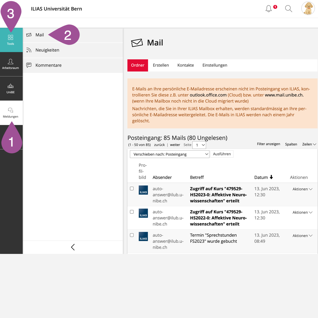 Please note that messages you receive in your ILIAS mailbox are also forwarded to your university email address by default. If mail forwarding to your email address is not working, you need to unblock the ILIAS sender in your Outlook. Emails sent directly to your university email address will, in turn, not appear in your ILIAS inbox.