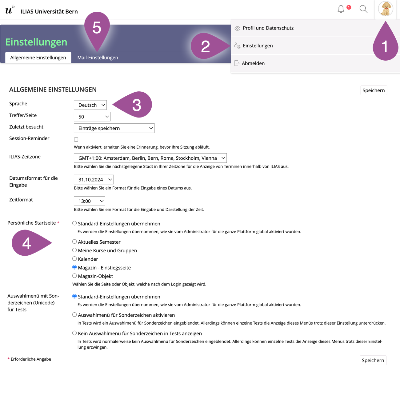 You can always return to your ILIAS start page via the Unibe icon. You can change your start page in the settings (see 1.2 User account settings). | |
