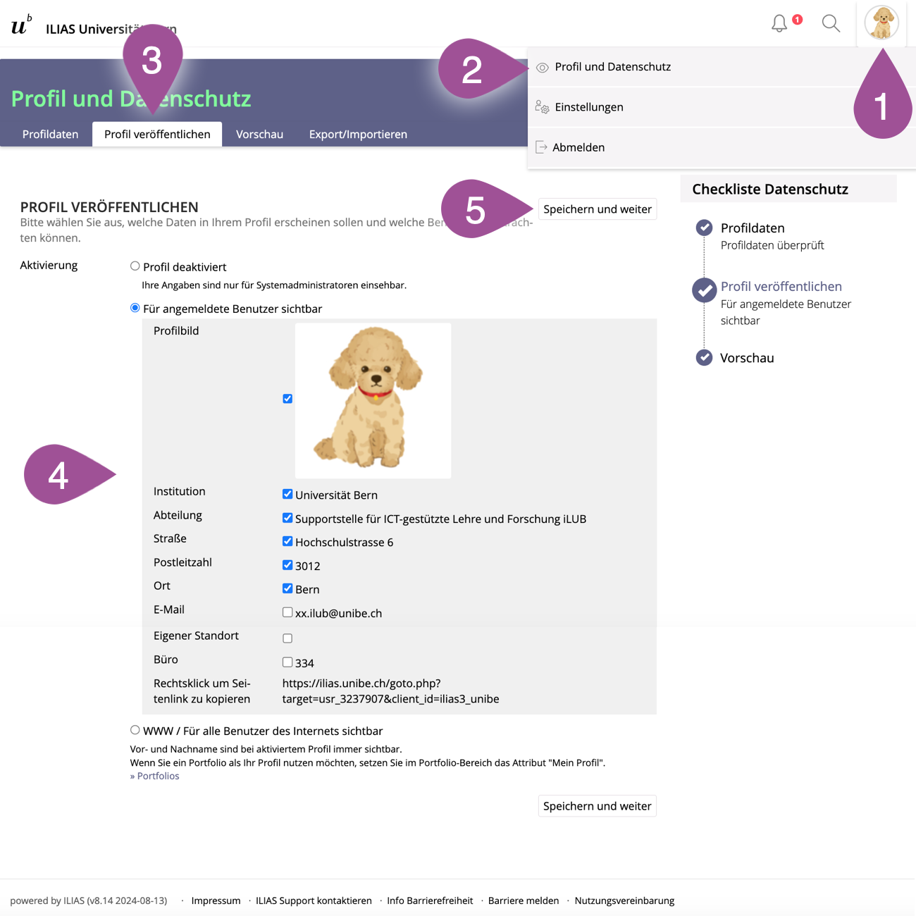 Under «Profile and Privacy» you can find your ILIAS user name and add additional personal information to your name and email address, which cannot be changed. It is also recommended to publish your profile, so that others (e.g. course members) can see your information and contact details in a course members gallery.