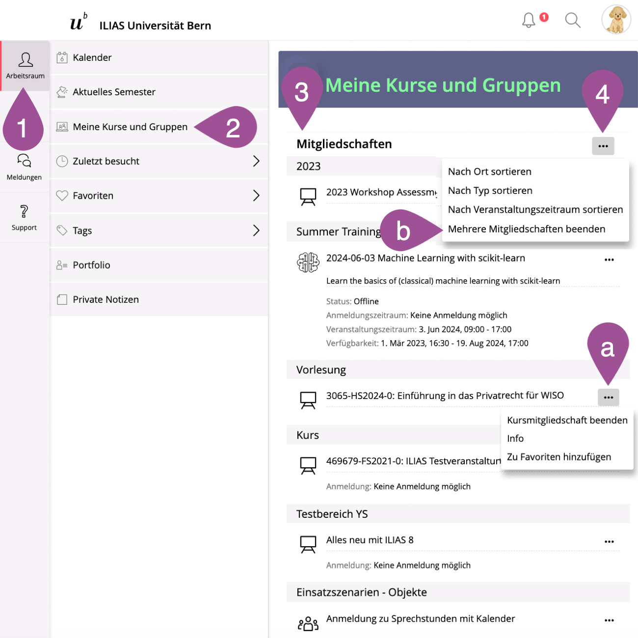 Use the «My Courses and Groups» submenu item to quickly navigate to your courses and groups that are not assigned to a semester (e.g., working groups).