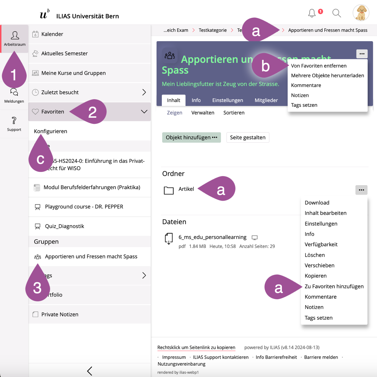 You can add (almost) any ILIAS item to your «Favourites» to create a custom quick access list. You will find direct links to the items (groups, courses, exercises, etc.) that you have placed on this list. Adding an item to your favourites will not work if the administrator has disabled this option for the item.