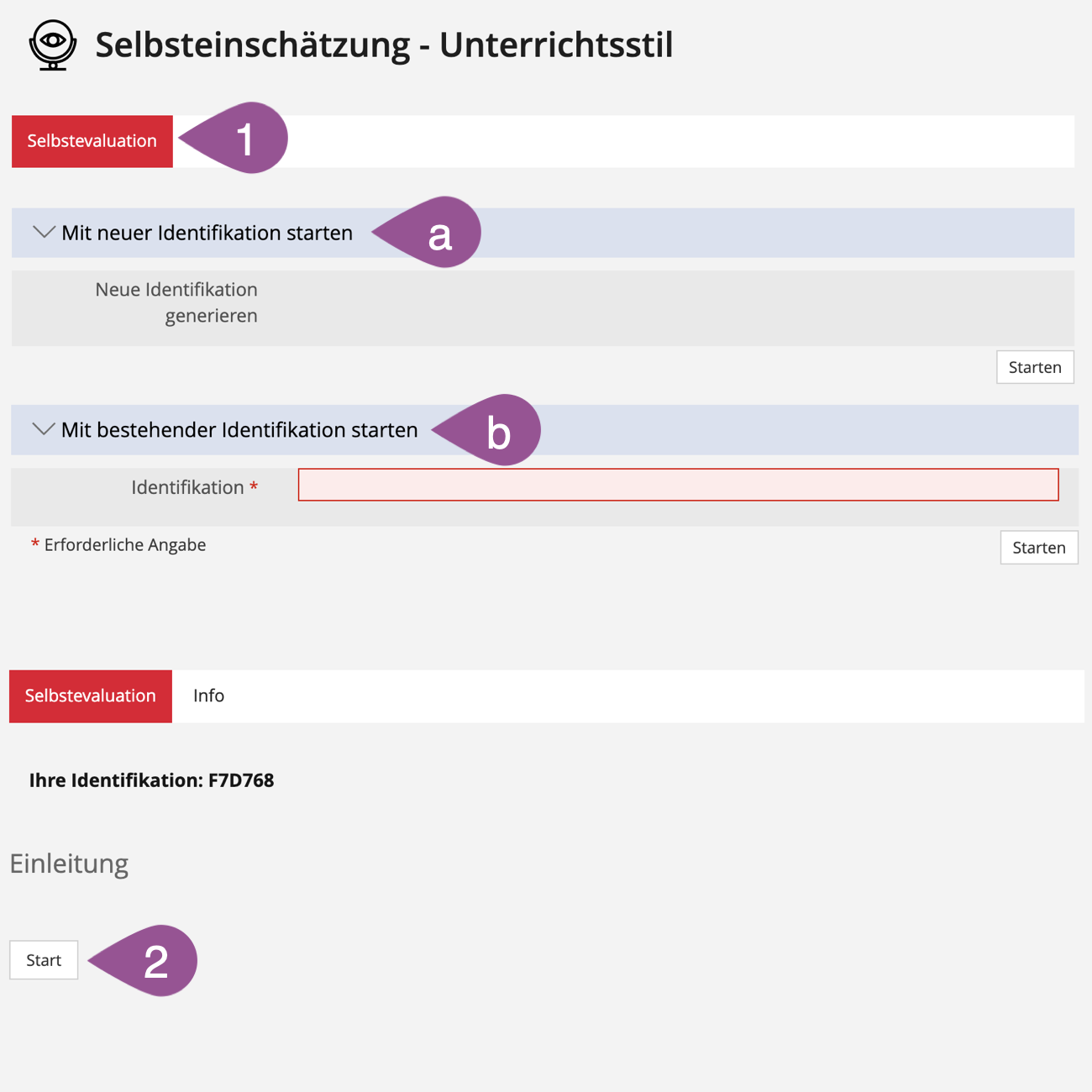 A start button and, depending on the settings, the introductory message will appear (see 2. Adjust settings). Click «Start» or «Antworten bearbeiten». If instead of the start button you see a note that the self-evaluation cannot be started, check the following:
