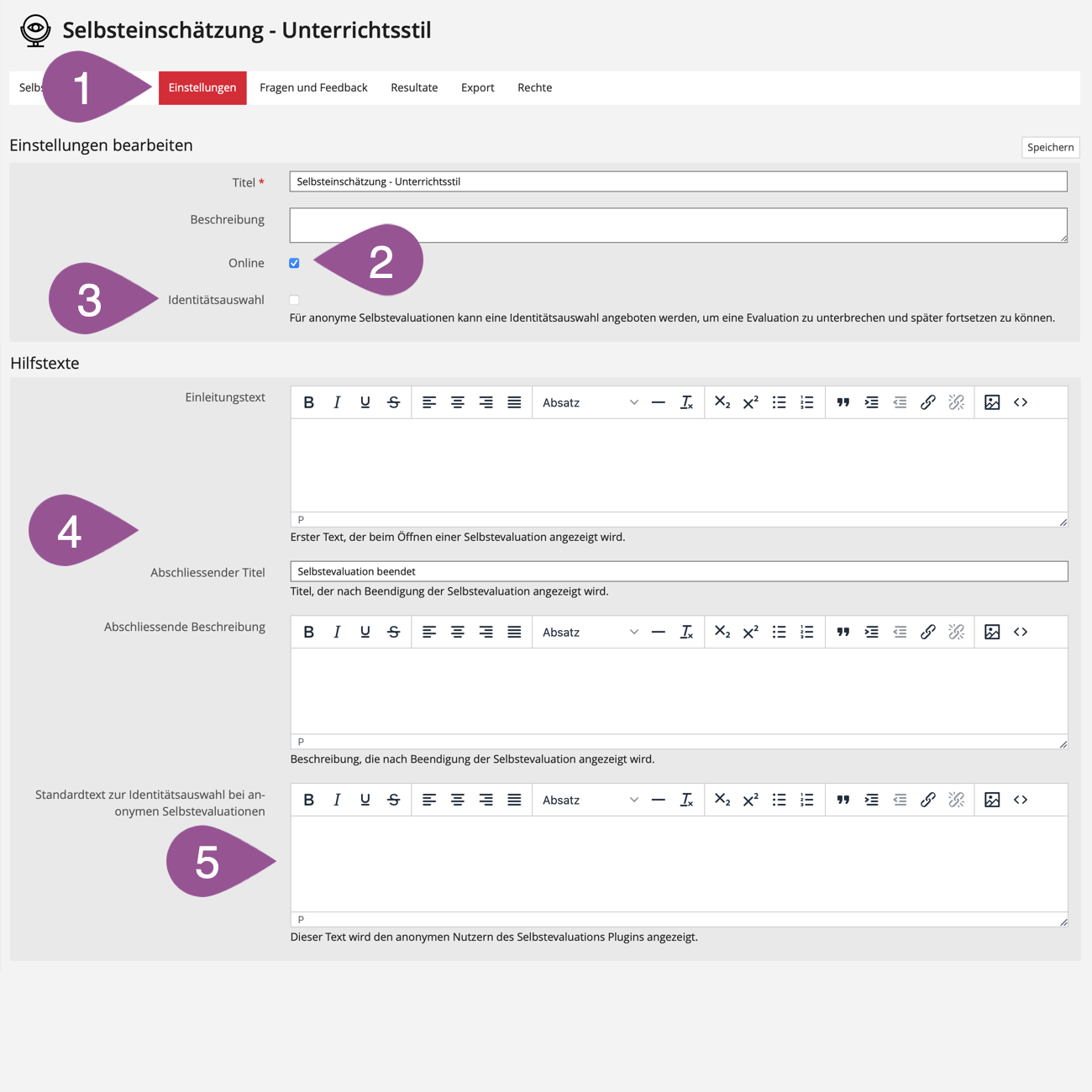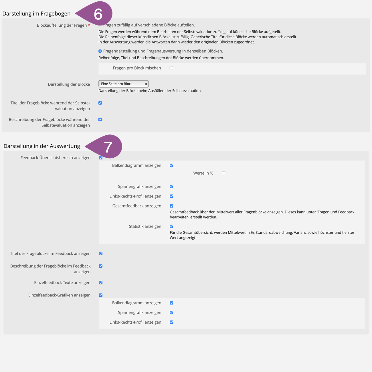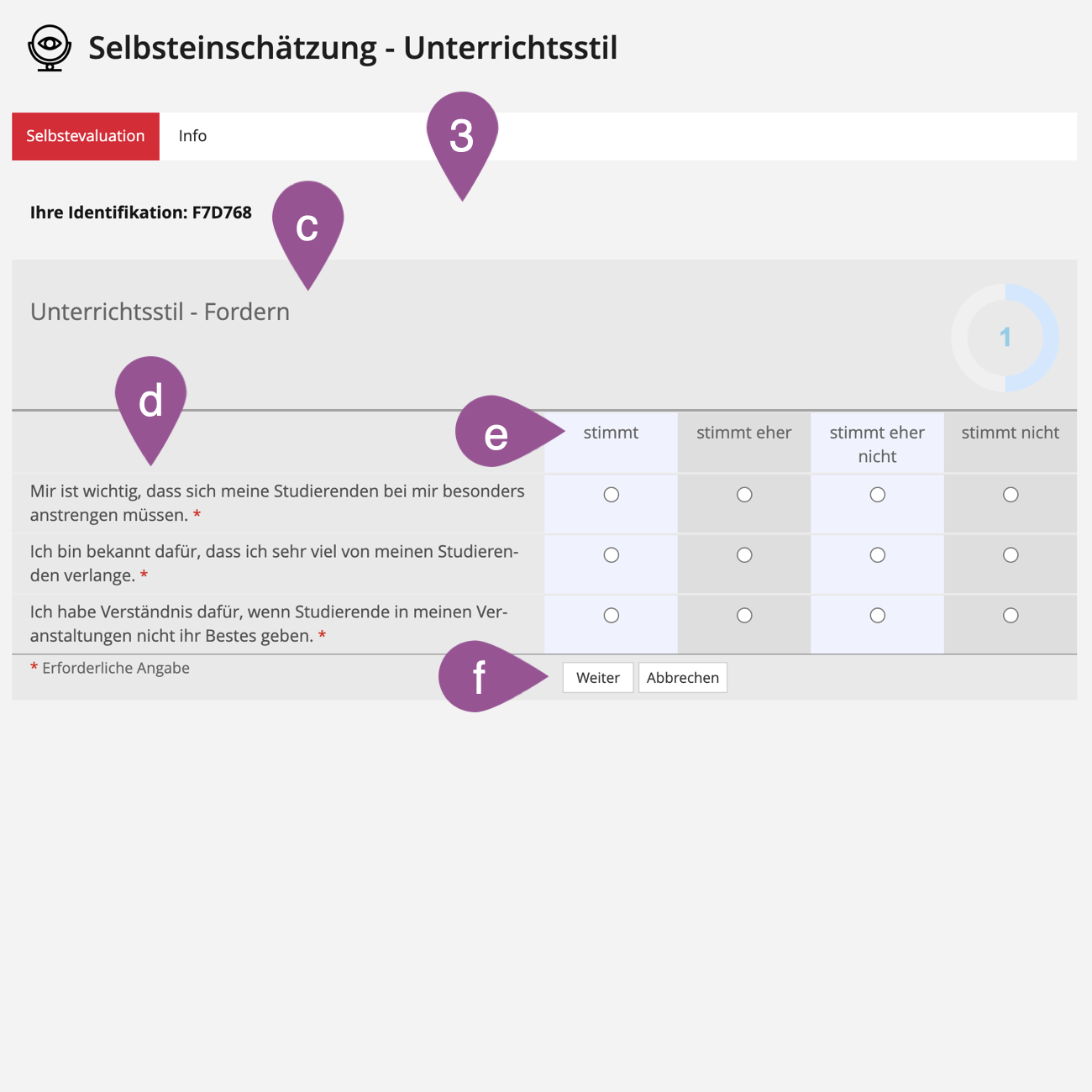 The most crucial aspect of self-evaluation is that participants do not simply answer questions, as is common with surveys or tests, but receive feedback regarding their answers in the individual blocks.