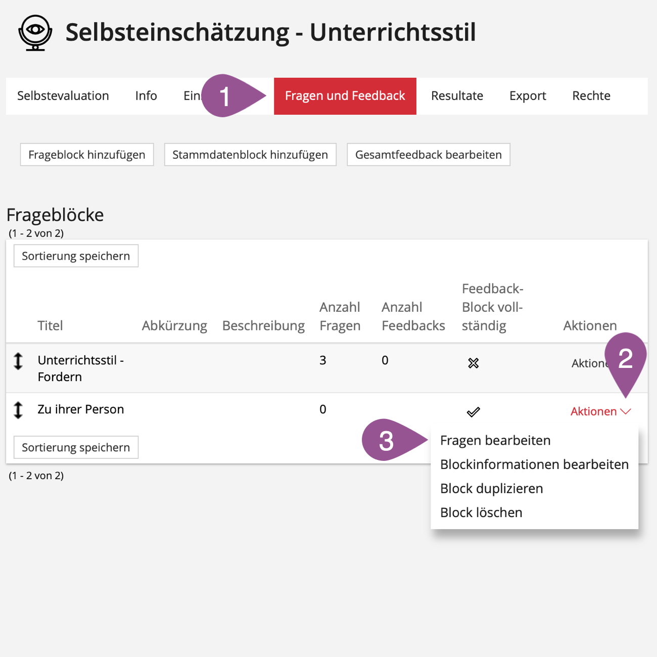 For question blocks, the entire percentage range has to be covered with feedback. You can see whether this is the case in the «Fragenblöcke» table in the «Feedback-Block vollständig» column («Fragen und Feedback» tab). | |||||