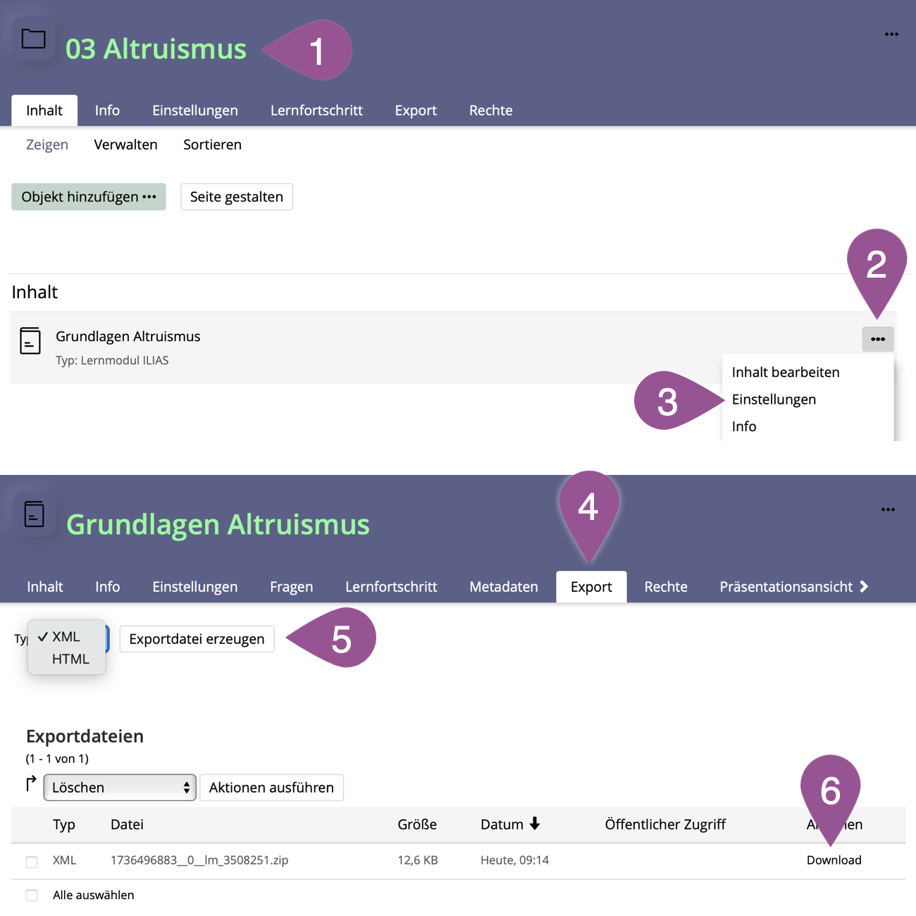 All ILIAS objects can be exported as an XML package. XML exports can be imported to ILIAS at the University of Bern or to another ILIAS installation (Add object >, e.g., learning module > Option 2: Import ILIAS learning module).