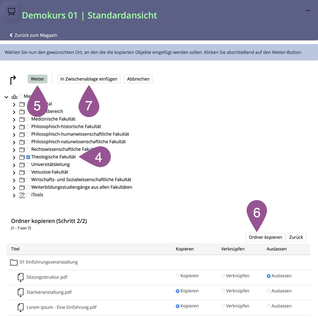 If you wish to reuse the content or continue to make it available in ILIAS, you can move or copy the objects to a current course or to an ILIAS workgroup.
