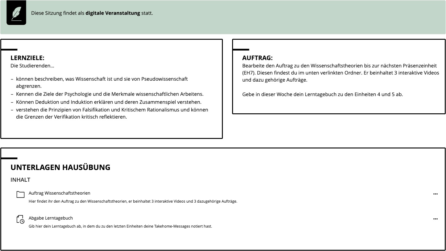 Im Tutorium „Einführung in die Psychologie“ HS25 [1] schrieben die Studierenden zu jeder Einheit ein Lerntagebuch. Darin hielten sie persönliche Take-Home Messages fest und reflektierten den Stoff mithilfe offener Fragen. Dies förderte aktives Lernen und kritisches Denken.