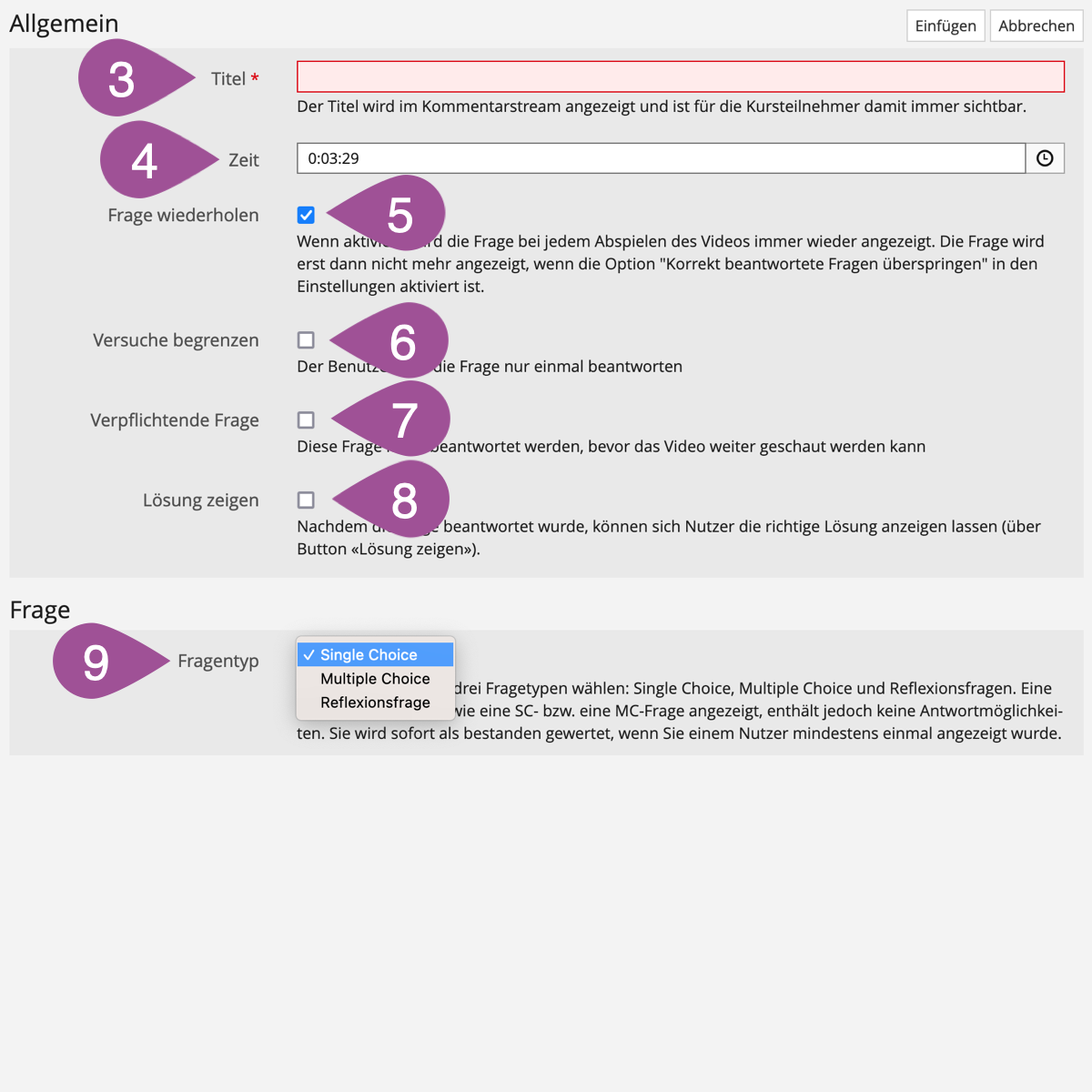 Navigieren Sie Im Video zum gewünschten Zeitpunkt und klicken Sie auf «Frage hinzufügen». | |