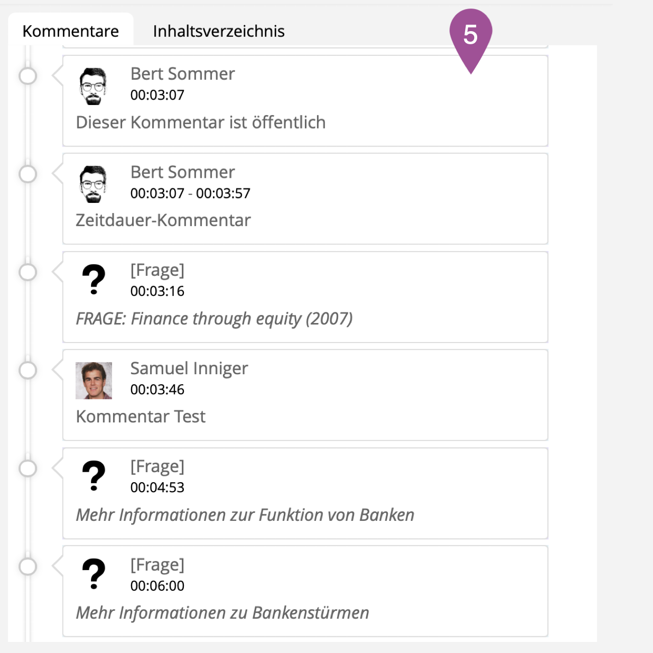 «Kommentare»: Hier werden Kommentare und Fragen aufgelistet. Ist die Option «Alle Kommentare von Beginn an zeigen» deaktiviert, werden nur jene Kommentare/Fragen angezeigt, die vor dem aktuellen Abspielzeitpunkt liegen. | |