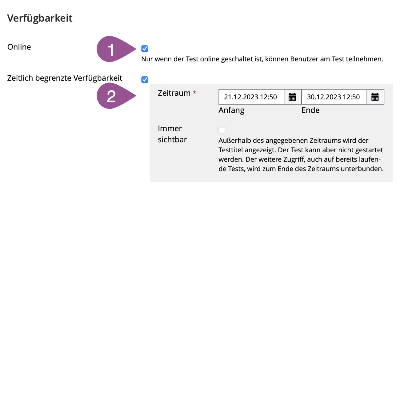 You can set the time period in which the test can be accessed. The test is automatically «Offline» outside this period even if the «Online» option is checked. |