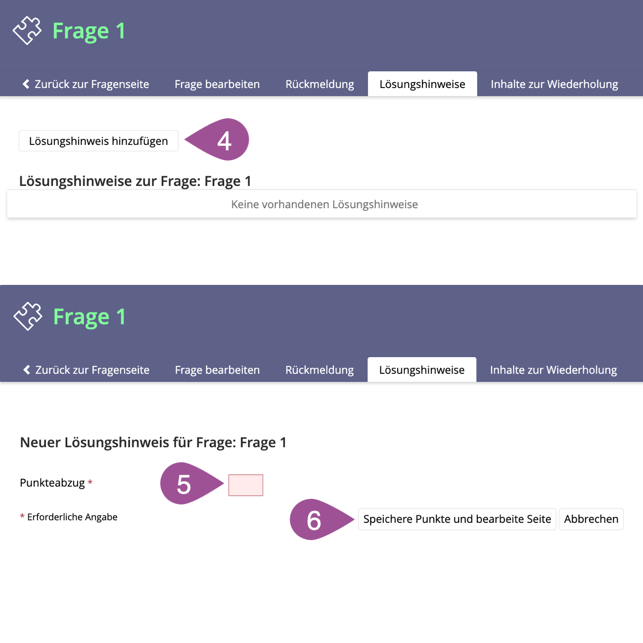 Click «Save Points and Edit Page». The page editor opens, which you can use to draft and design your hints (see Manual: Page Editor). This step is not necessary if the option «Use Rich-Text-Editor (TinyMCE) for editing questions and answers, feedbacks and hints» was selected when creating the question (see 4.1 Create questions). In this case, draft and format your hints directly in the editors provided on the page. |