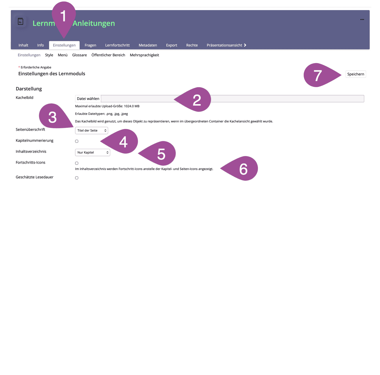 Unter «Kachelbild» können Sie für das Lernmodul ein Kachelbild hochladen (siehe auch Anleitung: Kacheldesign).