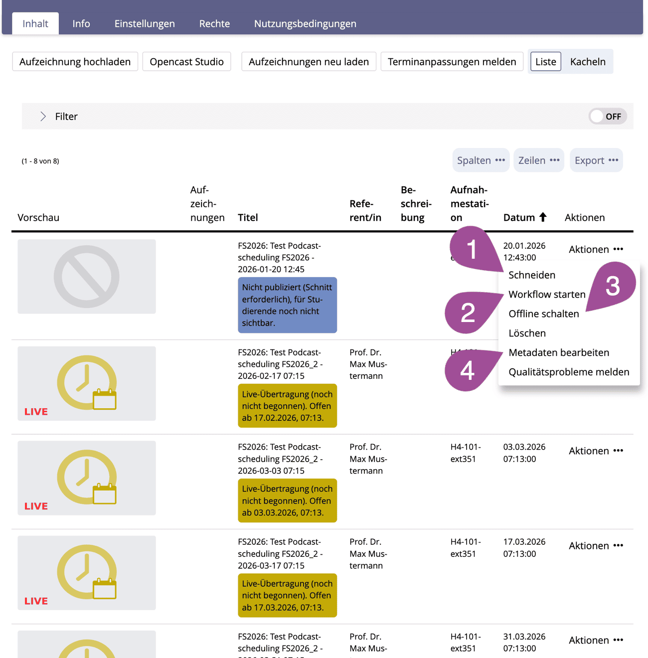 Before starting the first recording, check the correctness of the scheduled dates in the «Opencast Series». Do the recording times correspond to the lecture times - plus a reserve of 2 minutes pre-recording and 5 minutes post-recording time per recording? You can identify dates scheduled for live streams by the «LIVE» note in the thumbnail. | |