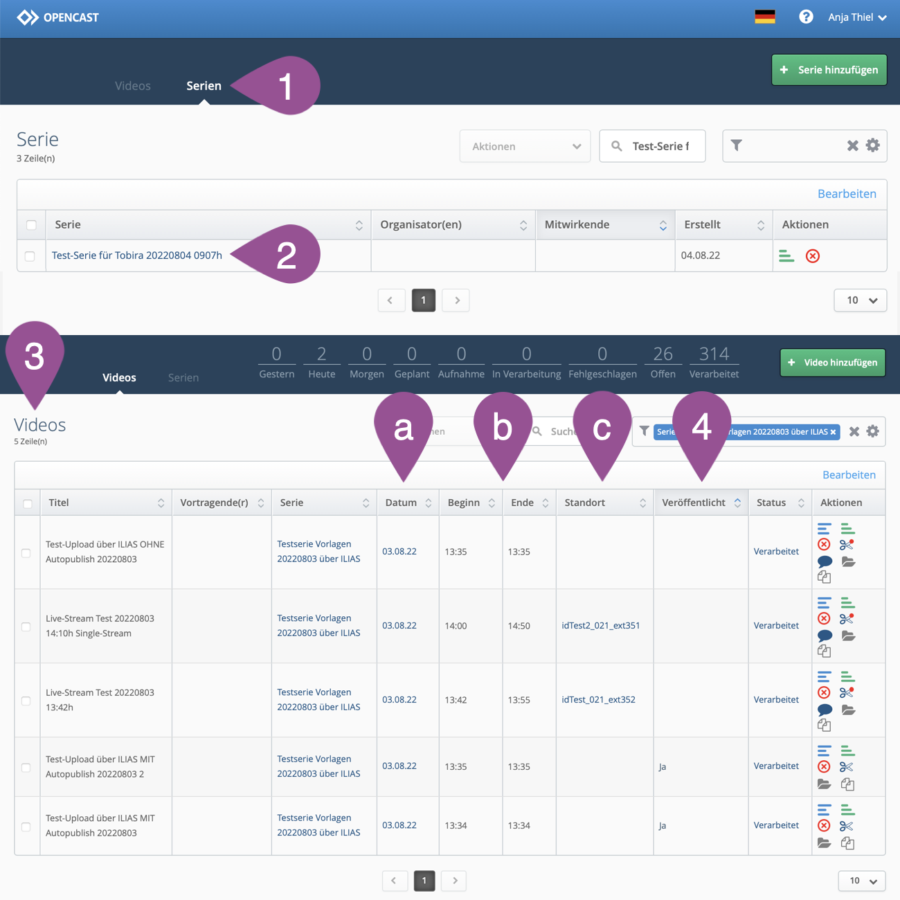 Additional functions are available in the «Opencast Serie». For more detailed information, you can consult the Manual: Opencast Series.