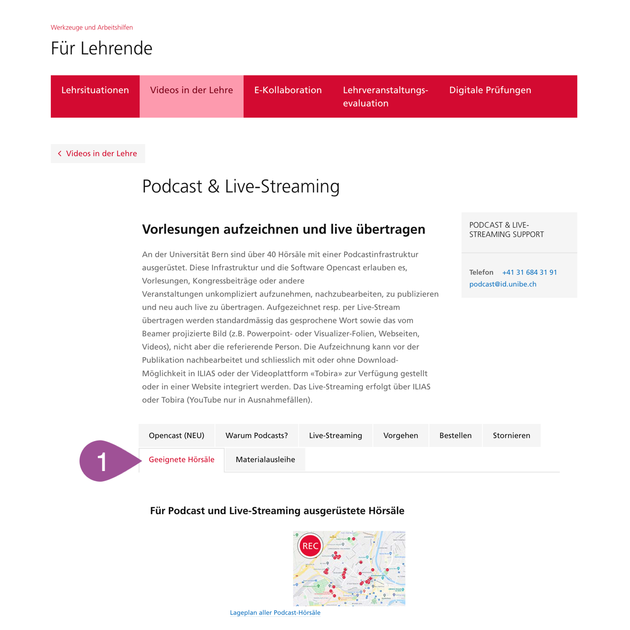 If a room is not equipped with podcast infrastructure or if a camera is required for recording or broadcasting, you can borrow this material from podcast support. Go to www.podcast.unibe.ch under «Borrowing material». | |