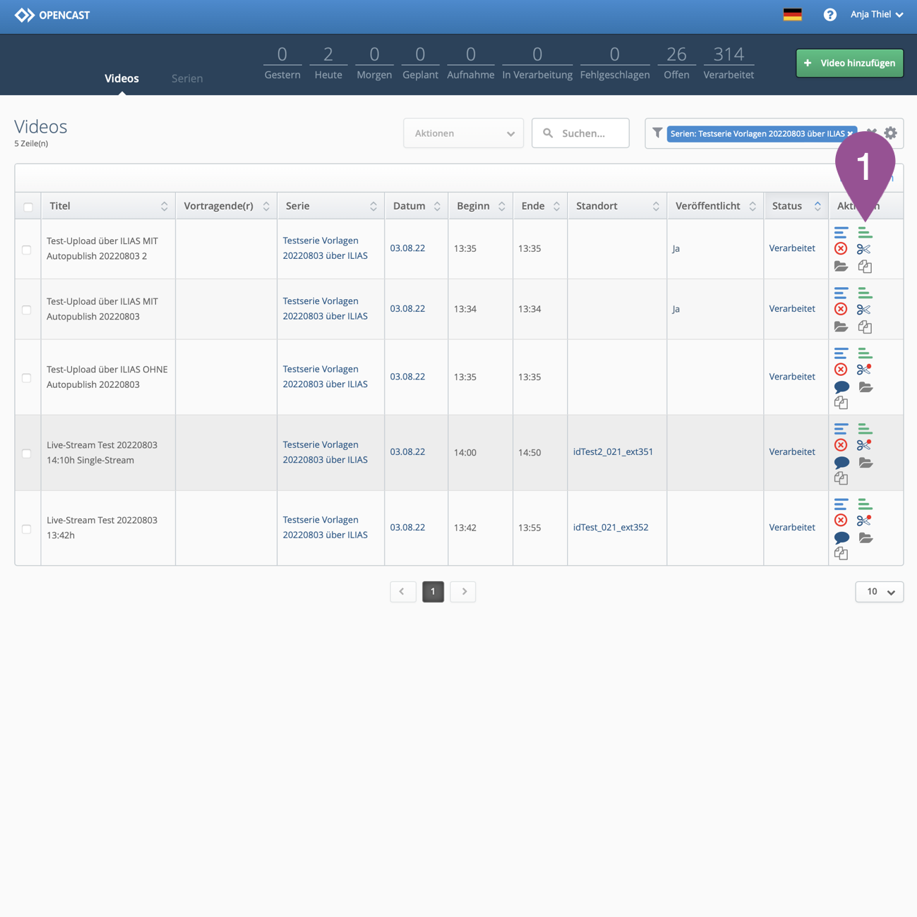To make the recording of a podcast or live stream available to students and course members in ILIAS or Tobira, it has to be edited and published first. This can be done via the ILIAS course. All associated recordings are recorded and displayed in the «Opencast Series». Recordings that have not yet been published are marked accordingly.
